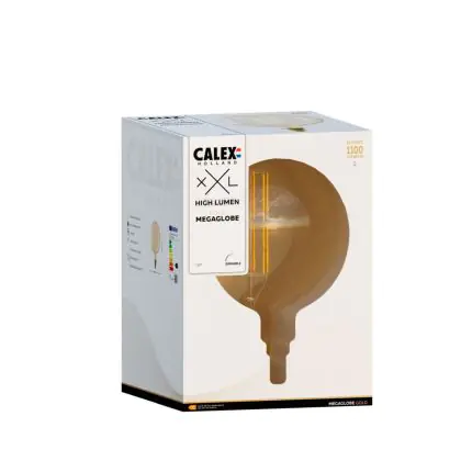 Die Calex XXL Mega Hohe Lumen Gold Globe LED E27 G125 Fadenlampe 3W 250lm- 821 Extra Warmweiß | Dimmbar ist eine effiziente E27 LED-Lampe mit Retrodesign und der perfekte Ersatz für Ihre konventionellen 100W Lampen mit E27. Zudem strahlt sie Licht in der Farbtemperatur 2100K - Extra Warmweiß aus und punktet durch eine lange Lebensdauer.