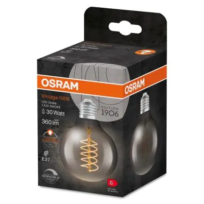 Die Ledvance Vintage 1906 LED E27 Globe Smoke 7.8W 360lm - 818 Extra Warmweiß | Dimmbar - Ersatz für 30W ist eine effiziente E27 LED-Lampe mit Retrodesign und der perfekte Ersatz für Ihre konventionellen 30W Lampen mit E27. Zudem strahlt sie Licht in der Farbtemperatur 1800K - Extra Warmweiß aus und punktet durch eine lange Lebensdauer.
