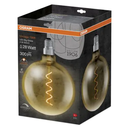 Die Osram Vintage 1906 LED E27 Globe Fadenlampe Gold 200mm 5W 300lm - 820 Extra Warmweiß | Dimmbar - Ersatz für 40W ist eine effiziente E27 LED-Lampe mit Retrodesign und der perfekte Ersatz für Ihre konventionellen 40W Lampen mit E27. Zudem strahlt sie Licht in der Farbtemperatur 2000K - Extra Warmweiß aus und punktet durch eine lange Lebensdauer.