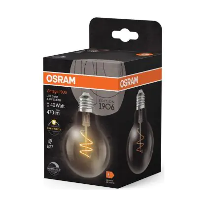 Die Osram Vintage 1906 LED E27 Globe Fadenlampe Klar 4.6W 470lm - 927 Extra Warmweiß | Höchste Farbwiedergabe - Dimmbar - Ersatz Für 40W ist eine effiziente E27 LED-Lampe mit Retrodesign und der perfekte Ersatz für Ihre konventionellen 40W Lampen mit E27. Zudem strahlt sie Licht in der Farbtemperatur 2700K - Extra Warmweiß aus und punktet durch eine lange Lebensdauer.